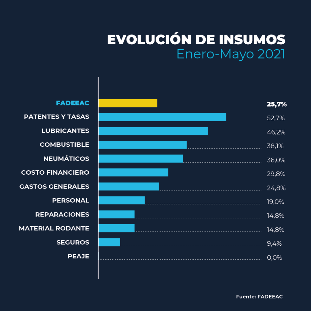 También se registraron aumentos en los costos de los equipos e insumos vinculados, sobre todo en Neumáticos (6.68%), Seguros (3%) y, en menor medida, Material Rodante (0.86%) y Reparaciones (0.72%), en el marco de la política de minidevaluaciones del tipo de cambio oficial y la continuidad de restricciones cambiarias y de importaciones. El incremento en Neumáticos alcanza en el año el 36% luego de liderar los incrementos de los rubros que componen el Índice de Costos en 2020 (71%) y 2019 (70%).