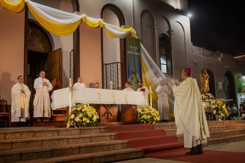 El altar se instaló frente al portal de la Catedral de cara a la multitud que se convocó en gran número, copando gran parte del entorno disponible. En este marco, estuvieron presentes Lucas Romero Spinelli, vicegobernador de la provincia de Misiones, Leonardo Stelatto, intendente posadeño, funcionarios provinciales y municipales.