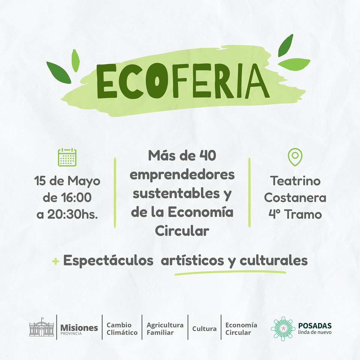 Este domingo 15 de Mayo se llevará adelante la Primer Ecoferia de Emprendedores Sustentables y de la Economía Circular, en el IV Tramo de la Costanera de Posadas entre las 15.30 y 20.30 horas. Desde la Secretaria de Cambio Climático, la Secretaria de Agricultura Familiar, la Secretaria de Cultura y la Municipalidad de Posadas invitan a los vecinos a participar de la feria y conocer a los más de 40 emprendedores registrados para el evento, muchos de ellos vendrán de otros municipios misioneros.