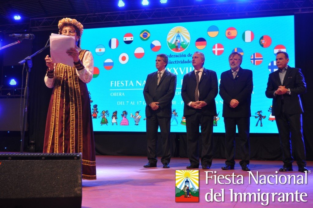 Ya en el Parque de las Naciones, las autoridades participaron de la Apertura oficial del predio. Se realizó el Encendido de la llama Votiva (a cargo Subcomisión Juvenil de Colectividades) y acto seguido se procedió al tradicional Corte de Cinta, con la presencia del Gobernador de la provincia de Misiones, Lic. Hugo Mario Passalacqua, el intendente a cargo, Dr. Ariel Cháves Rossberg, y el presidente de Federación de Colectividades Juan Hultgren, entre otras autoridades provinciales y locales, Cuerpo Consular, colectividades, fuerzas de seguridad y público en general. Desde allí, la comitiva se trasladó al escenario mayor donde se realizó el Cuadro Apertura. Seguidamente, dio inicio el Acto Protocolar, con palabras de la Cónsul Honoraria de Rusia- Belarusia, Zenona Arciuk de Zabczuk, en representación de los hijos y nietos de inmigrantes, del presidente de Federación, Intendente a cargo y del Gobernador.