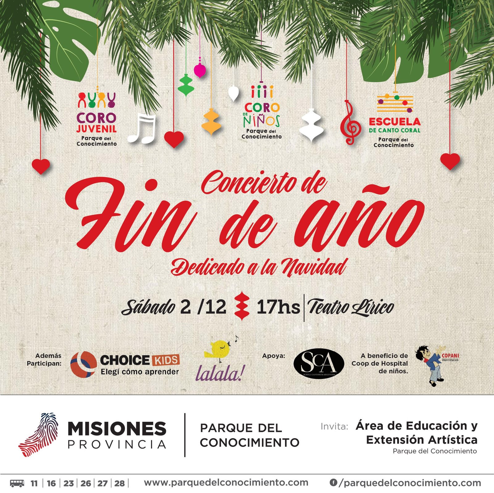 El Área de Educación y Extensión Artística del Parque del Conocimiento invita al Concierto de Fin de Año dedicado a la Navidad. En este evento participarán 90 niños y jóvenes que actualmente forman parte de los elencos de la Escuela de Canto Coral del Parque y del Staff LATE; además se contará con la participación de los niños cantores del Choice Kids , del Coro Lalala y músicos invitados. Este evento estará dedicado al Hospital Pediátrico.