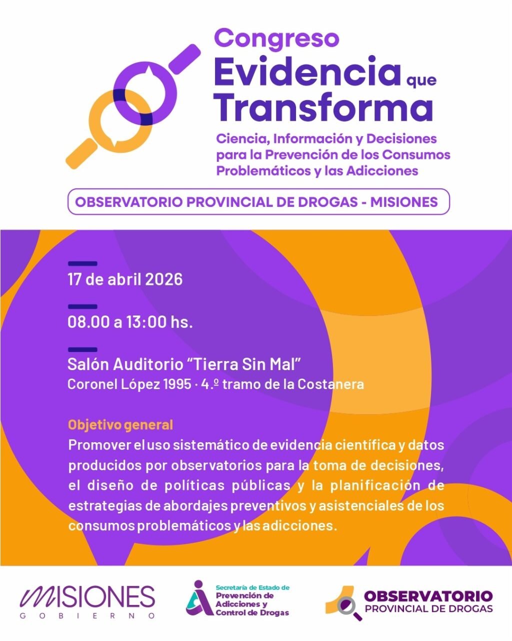 El 17 de abril desde las 7.30 en el Auditorio “Tierra Sin Mal” se realizará el Congreso “Evidencia que Transforma: Ciencia, Información y Decisiones para la Prevención de los Consumos Problemáticos y las Adicciones”, organizado por la Secretaría de Estado de Prevención de Adicciones y Control de Drogas de la Provincia de Misiones.
