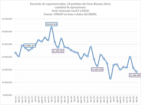 Hasta el mismo mes de 2024, ya con Javier Milei como Presidente, cayeron en unos 300 mil más y descendieron a 12.603.395 en el año pasado, lo cual representó una pérdida de casi 3 millones de operaciones registradas en las cajas de los súper. Y en 2026, se resignaron otras 936.446, de acuerdo con datos oficiales