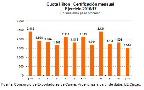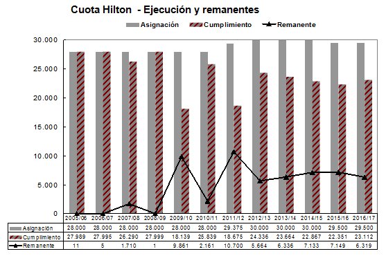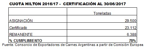 CUOTA HILTON: Al cierre del ejercicio 2016/2017, se certificaron 23.112 toneladas dentro del contingente Hilton, lo que representó el 78% del total. Ello arroja un remanente de 6.388 toneladas, 761 toneladas inferior al del período 2015/2016.