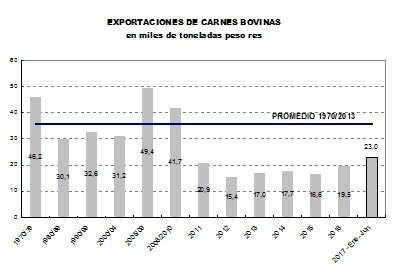 En el primer semestre de 2017, las exportaciones de carnes bovinas han sumado 139 mil toneladas peso res, un 22% más que en igual lapso de 2016. Los embarques han subido un pequeño escalón en los últimos meses, elevando el promedio mensual a 23 mil toneladas peso res, apenas 4 mil toneladas por encima del magro registro del año pasado.