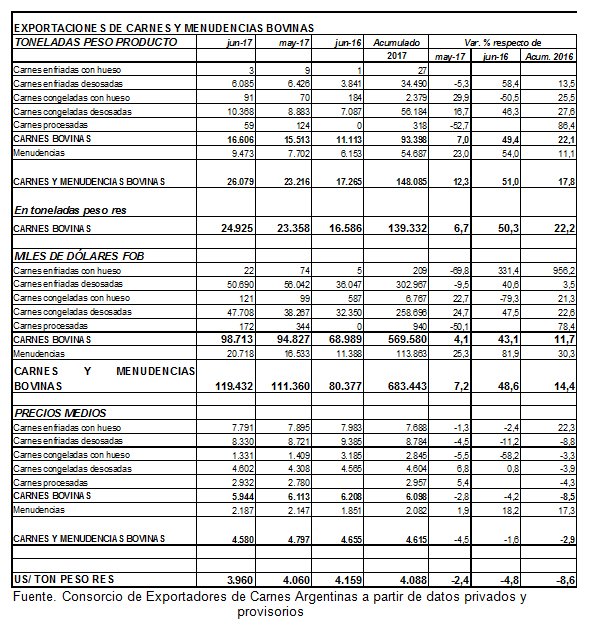 En junio de 2017, el valor total facturado en concepto de carnes bovinas fue de 99 millones de dólares, 4% mayor al del mes precedente. Las exportaciones de menudencias también aumentaron en junio de 2017, alcanzando 9.5 miles de toneladas peso producto por valor de 21 millones de dólares, un 25% por encima del período anterior. La recuperación se concentró en Hong Kong, que mejoró sensiblemente luego de la baja del mes precedente, y en menor proporción en Rusia.