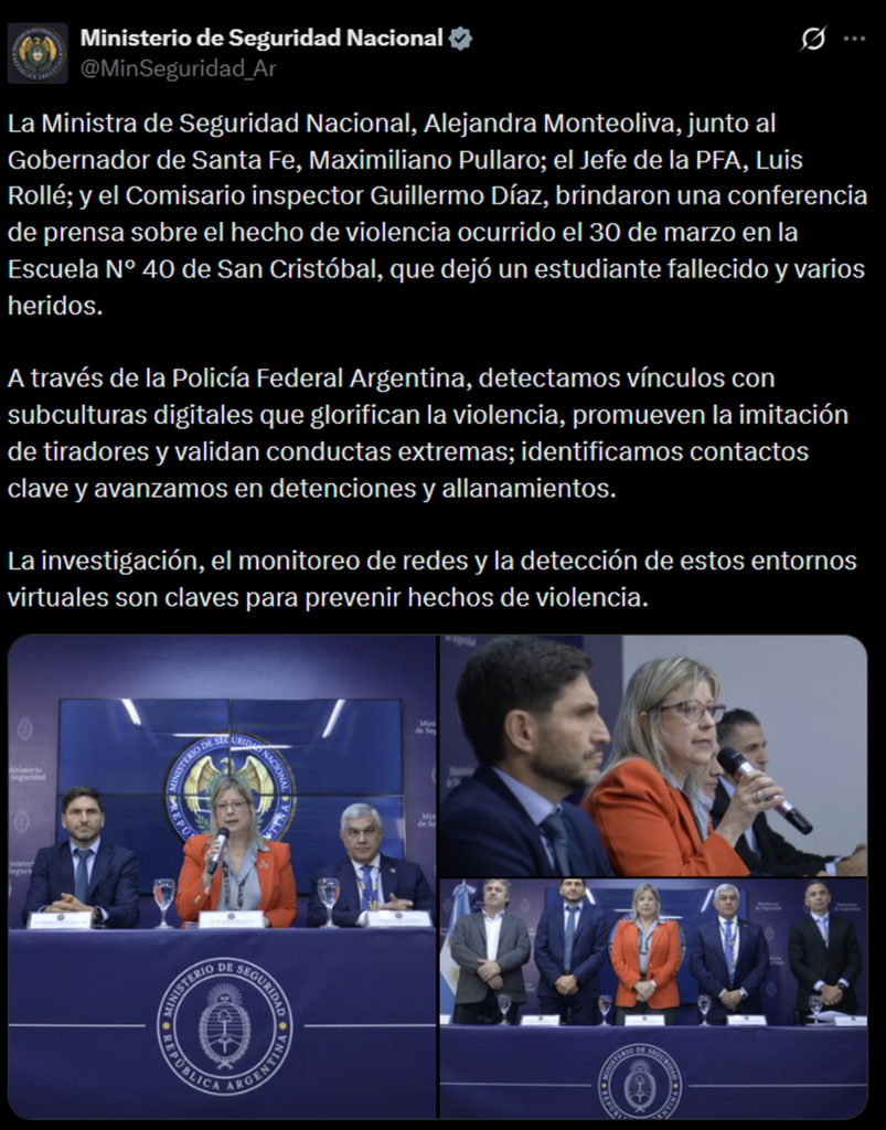 Las autoridades insistieron en que el problema no puede analizarse únicamente desde lo local. “No tiene que ver con lo que pueda suceder en una comunidad, escuela, provincia o país”, sostuvo Pullaro, sino con una lógica global que encuentra en internet su principal espacio de expansión.