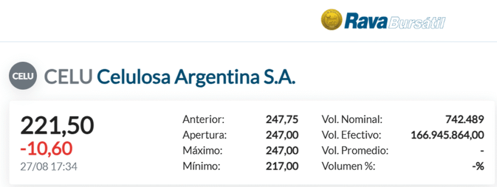 El 27 de agosto, tras difundirse los balances, las acciones de Celulosa (CELU) se desplomaron 10,6%, cerrando en $221,50 tras haber tocado un mínimo intradiario de $217. Con 742.000 papeles negociados y un volumen de $166,9 millones, la señal de los inversores fue clara: la empresa enfrenta un escenario límite.