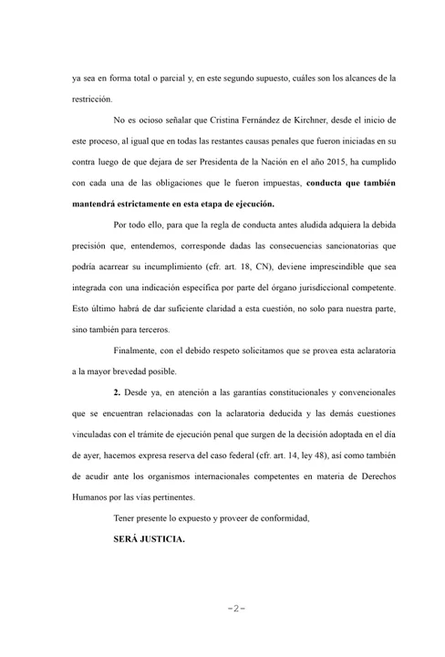 La ex presidenta Cristina Fernández de Kirchner presentó este martes, a través de sus abogados Carlos Beraldi y Ary Llernovoy, un pedido formal de aclaratoria ante el Tribunal Oral Federal 2 para que se precise si puede o no salir al balcón de su casa a saludar a la militancia, en el marco de la prisión domiciliaria que comenzó a cumplir tras el fallo de la causa Vialidad.