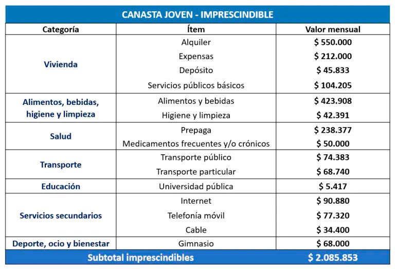 El estudio, basado en la construcción de una “Canasta Joven”, estima el gasto mensual necesario para una persona de entre 20 y 30 años. Para ello, se dividieron los consumos en dos grandes grupos: gastos imprescindibles y consumos variables asociados al estilo de vida urbano.