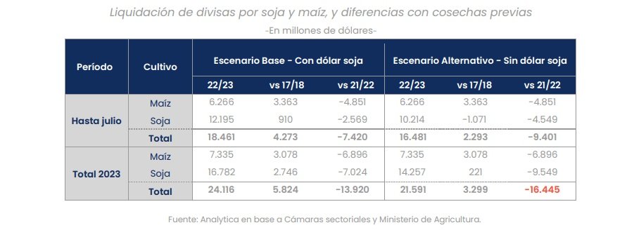 a) En 2023, la sequía provocaría una reducción de ingresos en dólares de hasta U$S 16.445 millones (U$S 9.549 millones para la soja y U$S 6.896 millones para el maíz), si no se habilitara una tercera edición del programa de estímulo a los exportadores de soja. Con dólar soja, los menores ingresos serían de U$S 13.920 millones.