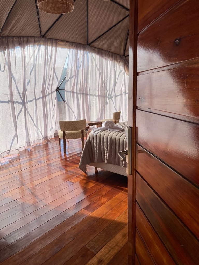 En diez hectáreas de selva preservada, los domos de más de 50 m² se levantan sobre parafitos para no alterar el suelo. Cada unidad cuenta con jacuzzi, cama king size, aire acondicionado ecológico, deck con vista al río y tratamiento completo de aguas residuales mediante biodigestores y lechos nitrificantes. La experiencia es inmersiva: el ventanal de 8 metros por 3 acerca la selva a centímetros del huésped, sin filtros.