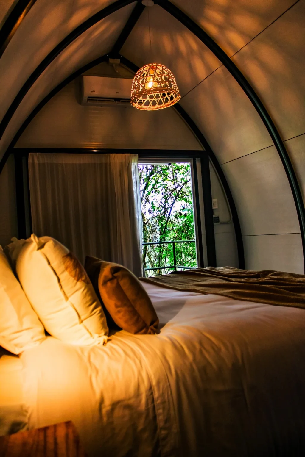 En diez hectáreas de selva preservada, los domos de más de 50 m² se levantan sobre parafitos para no alterar el suelo. Cada unidad cuenta con jacuzzi, cama king size, aire acondicionado ecológico, deck con vista al río y tratamiento completo de aguas residuales mediante biodigestores y lechos nitrificantes. La experiencia es inmersiva: el ventanal de 8 metros por 3 acerca la selva a centímetros del huésped, sin filtros.