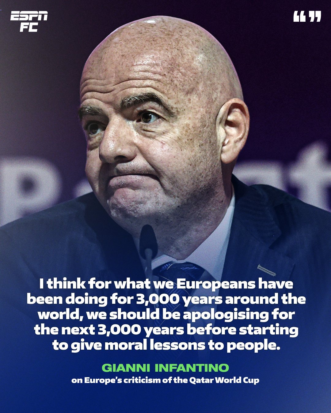 Ante unos 400 periodistas reunidos en el espectacular anfiteatro del centro de prensa del Mundial, el mandamás de FIFA señaló: “Las críticas por el Mundial son hipócritas. Por lo que los europeos hemos hecho durante los últimos 3.000 años deberíamos estar pidiendo perdón los próximos 3.000 antes de dar lecciones de moral a los otros. Estas lecciones de moral son simplemente hipocresía”.