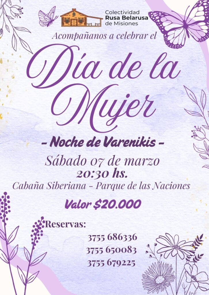 La Colectividad Rusa Belarusa de Misiones invita a vivir una noche especial, este 7 de marzo, a las 20:30 hs, en la Cabaña Siberiana del Parque de las Naciones, para homenajear a las mujeres que, con su fuerza, compromiso y amor por sus raíces, engrandecen nuestra cultura y nuestra comunidad.
