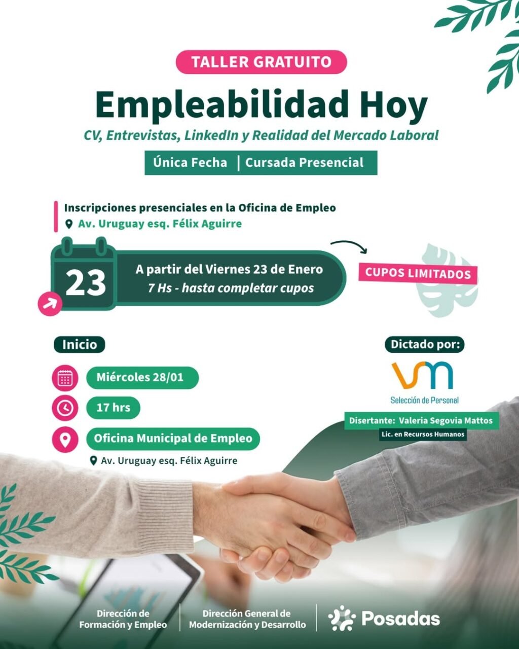 La Oficina de Empleo dictará un taller de empleabilidad orientado a mejorar la inserción laboral, brindando herramientas prácticas para la elaboración de CV, el desarrollo del perfil profesional y la búsqueda activa de trabajo.