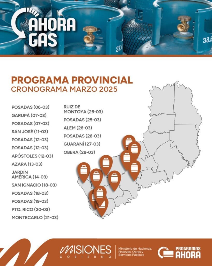 En el mes de marzo, además de los operativos que regularmente se hacen en Posadas (en barrios y en el Mercado Concentrador), Ahora Gas también estarán recorriendo las localidades de Garupá, San José, Apóstoles, Azara, Jardín América, San Ignacio, Puerto Rico, Montecarlo, Ruiz de Montoya, Alem, Guaraní y Oberá.