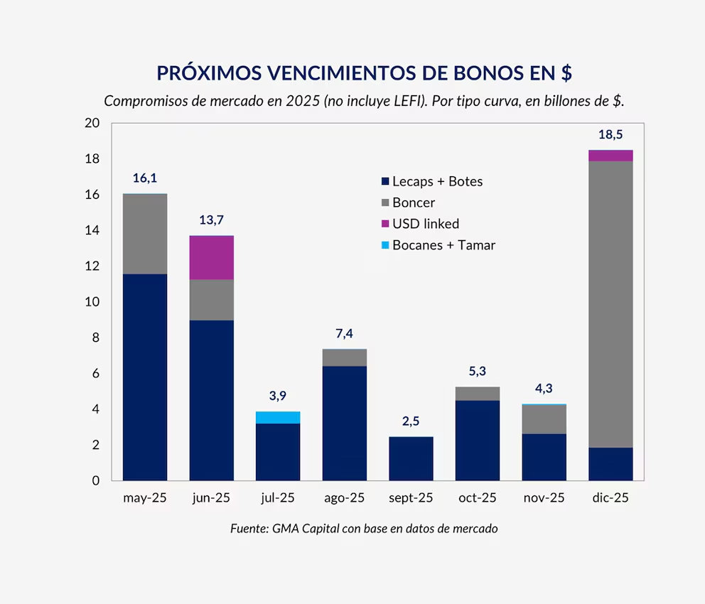 El Tesoro afrontará en mayo vencimientos por $16,1 billones y en junio otros $13,7 billones, según estimaciones de GMA Capital. En las últimas licitaciones se observó una fuerte preferencia del mercado por instrumentos de corto plazo, con tasas de corte elevadas, lo que encendió luces de alerta en el equipo económico.