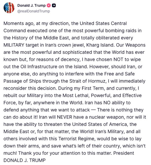 Trump sostuvo que las fuerzas estadounidenses “aniquilaron todos los objetivos militares” en la isla, aunque aclaró que decidió no destruir la infraestructura petrolera. Al mismo tiempo, lanzó una advertencia explícita: si Irán interfiere con el tránsito marítimo en el estrecho de Ormuz, Estados Unidos podría reconsiderar esa decisión.