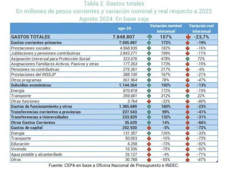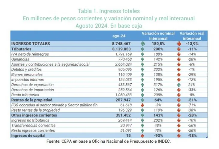 El informe también expone una reducción en los ingresos en el Sector Público Nacional (SPN): para agosto del 2024, el país percibió $8,7 billones, lo que representa una reducción de 13,9% interanual -contemplando el ajuste por inflación- y la segunda caída más importante en la recaudación de lo que va del año.