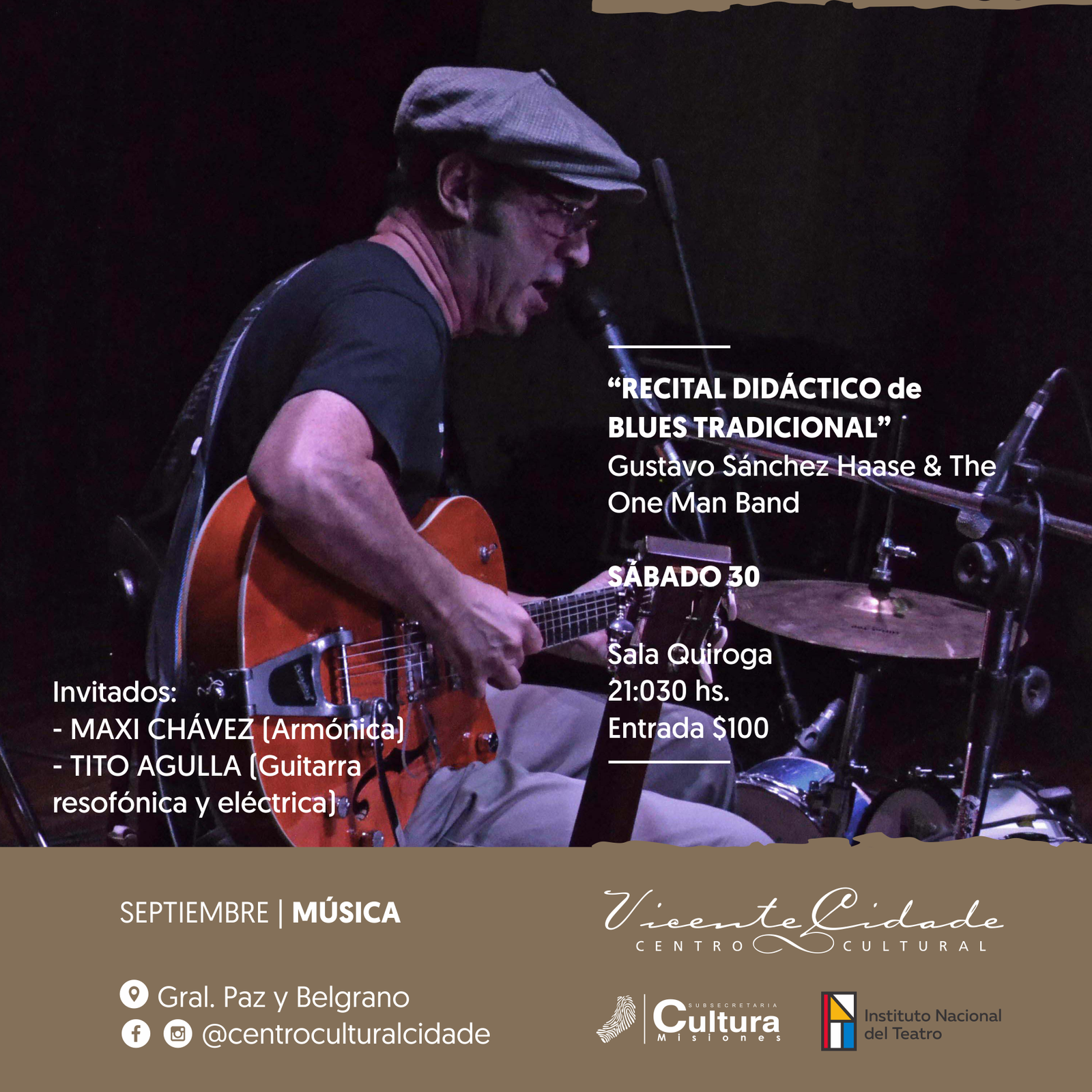 El blues y sus instrumentos de expresión: El sábado 30 de septiembre a las 22:00 en la Sala Quiroga del Centro Cultural Vicente Cidade el guitarrista y cantante de Blues tradicional, de Encarnación (Py) , Gustavo Sánchez Haase, por medio de su proyecto “ Gustavo Sánchez Haase & The One Man Band”, junto a los músicos invitados Maxi Chávez en armónica, y Tito Agulla en guitarra eléctrica y resofónica, presenta un concierto didáctico, en el cual hará un viaje musical por las raíces del Blues , con los instrumentos primitivos y tradicionales. Derecho de espectáculo $100.