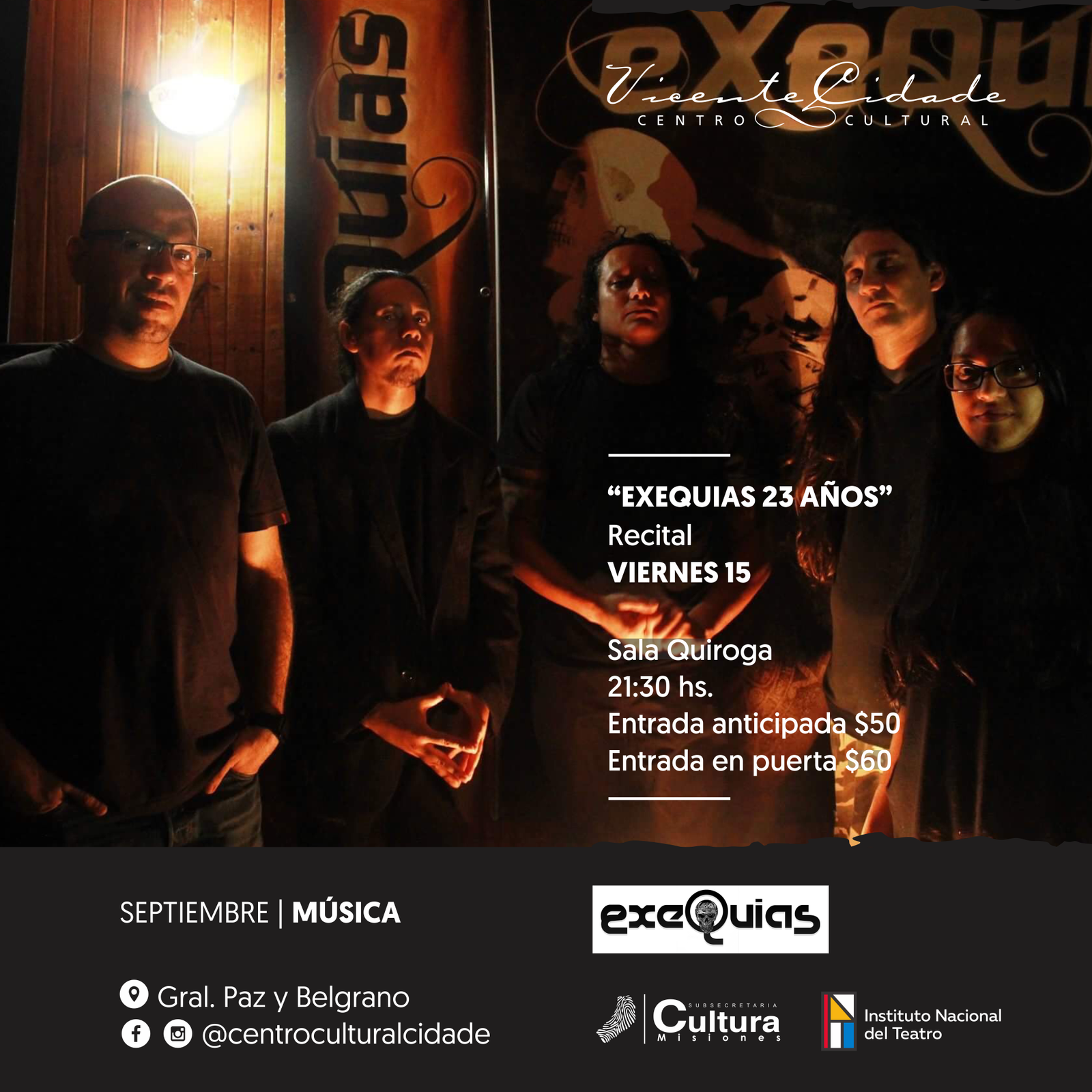Exequias festeja 23 años en el Cidade: El viernes 15 de septiembre a las 21:30 horas en la Sala Quiroga del Centro Cultural Vicente Cidade, la mitica banda de rock “”Exequias” festejarán sus 23 años con la música en un recital con interacción multimedia y teatral. Las entradas anticipadas tienen un valor de $50, en puerta $80.