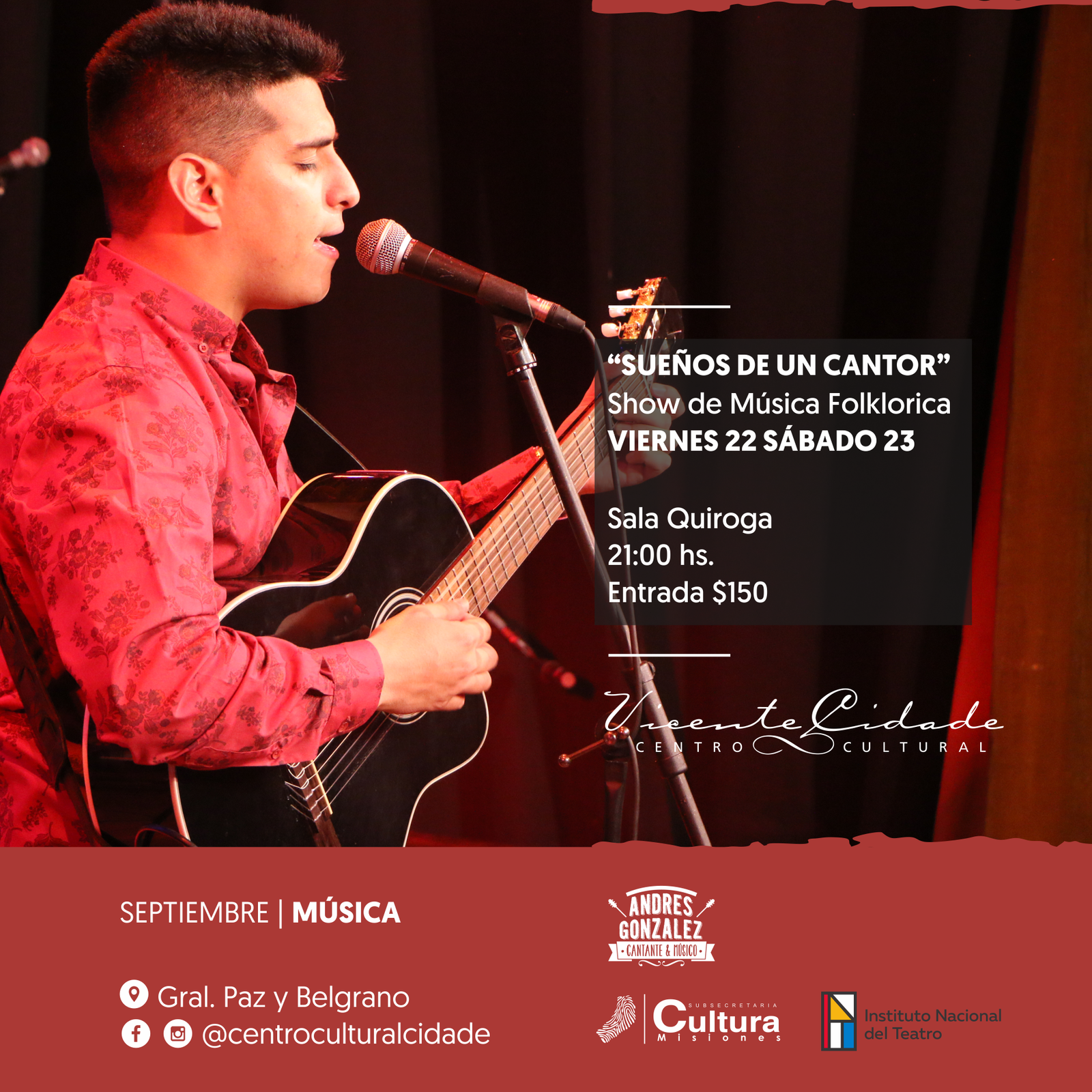 Sueños de un cantor: Los días viernes 22 y sábado 23 de septiembre a las 21:00 horas el compositor y cantautor Andrés González realizará dos conciertos para presentar sus composiciones en la Sala Quiroga del Centro Cultural Vicente Cidade. El derecho de espectáculo $100.