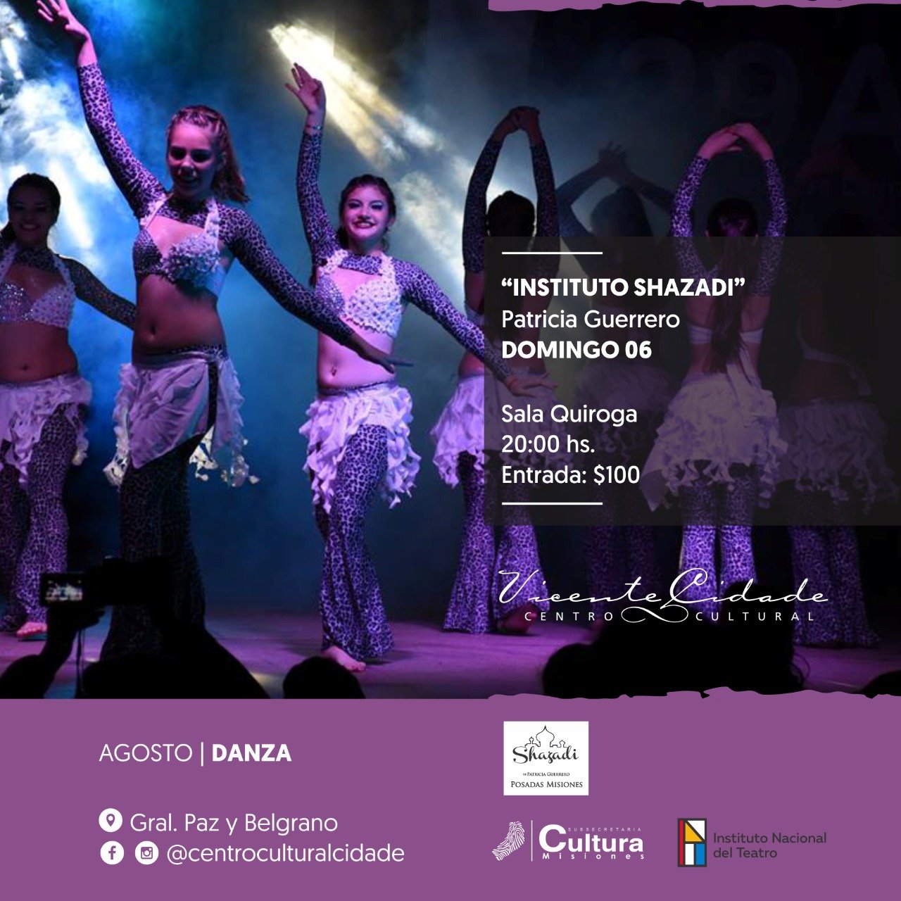 Muestra del Instituto Shazadi: El domingo 6 de agosto a las 20:00 horas en la Sala Quiroga del Centro Cultural Vicente Cidade el Instituto Shazadi realizará una muestra de Danzas donde se verán las coreografías aprendidas durante el año, en cada horario y cada grupo. Derecho de espectáculo $100.