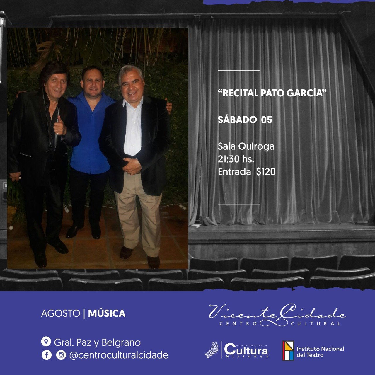 Noche latinoamericana: El sábado 5 de agosto a las 21:30 horas en la Sala Quiroga del Centro Cultural Vicente Cidade el trío de músicos conformado por Ángel Pato García, Beto Encina y Rody Sánchez se subirán al escenario para deleitar al público con un repertorio de música donde se destacan guaranias, chamamés, vallenatos y boleros. Derecho de espectáculo $120.