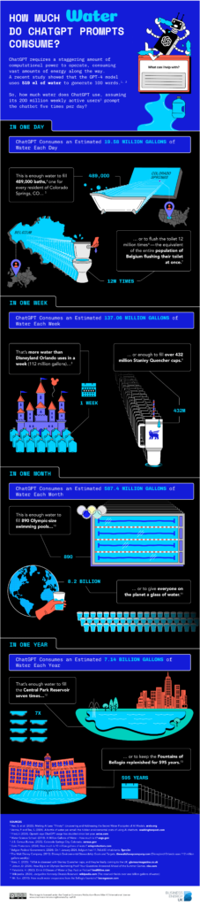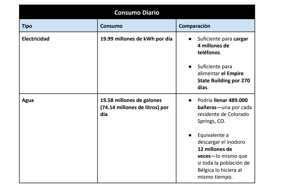 ● ChatGPT consume aproximadamente 74.14 millones de litros de agua al día Esto equivale a llenar 489.000 bañeras, una por cada residente de Colorado Springs, CO… o a descargar el inodoro 12 millones de veces, lo mismo que si toda la población de Bélgica lo hiciera al mismo tiempo.