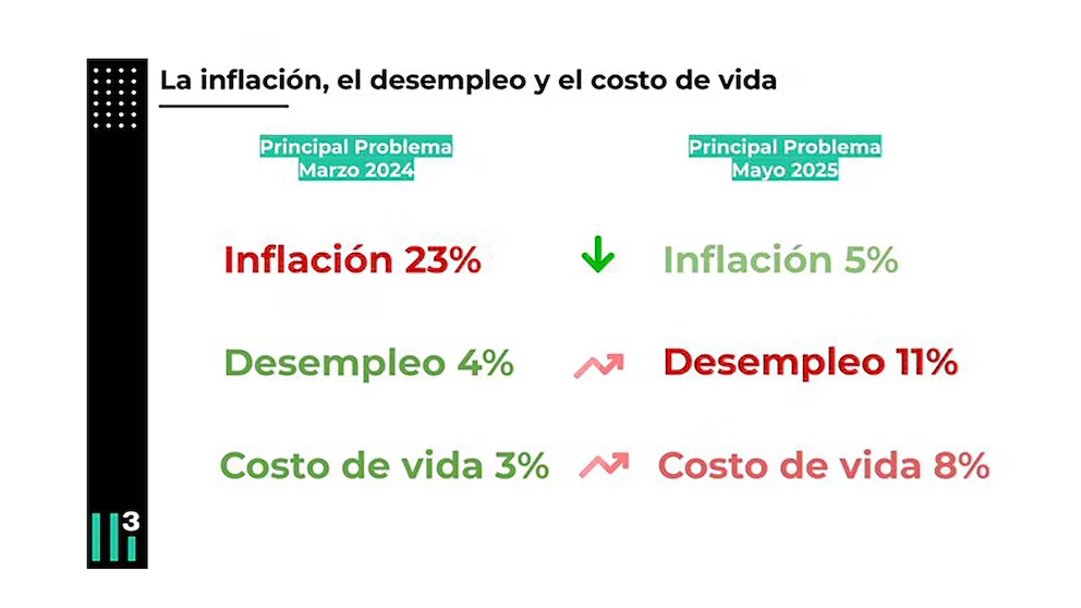 Según datos recientes de consultoras y del INDEC, la inflación dejó de ser el problema económico que más inquieta a la población. En mayo de 2025, apenas el 5 % de los argentinos mencionó la suba de precios como su principal preocupación, frente al 23 % que lo hacía en marzo de 2024. En cambio, el desempleo pasó del 4 % al 11 % y el costo de vida del 3 % al 8 %, según el relevamiento de Casa Tres, dirigido por Mora Jozami.