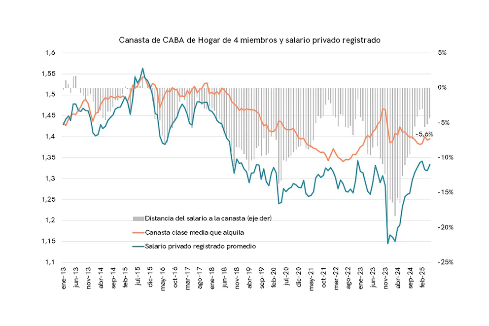 Aunque la inflación sigue bajando y el Gobierno mantiene el tipo de cambio estable, incluso a costa de perder reservas en el Banco Central, el impacto real en los bolsillos no mejora. El salario promedio registrado en el sector privado estaba en enero 3 % por debajo del umbral que define la clase media según la canasta de la Ciudad de Buenos Aires. En mayo, esa brecha se amplió al 5,6 %.