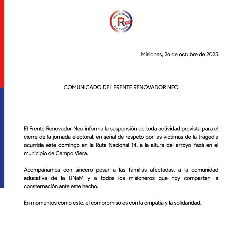 El Frente Renovador Neo informó este domingo la suspensión de todas las actividades previstas para el cierre de la jornada electoral, en señal de respeto por las víctimas del trágico accidente ocurrido en la Ruta Nacional 14, a la altura del arroyo Yazá, en el municipio de Campo Viera.