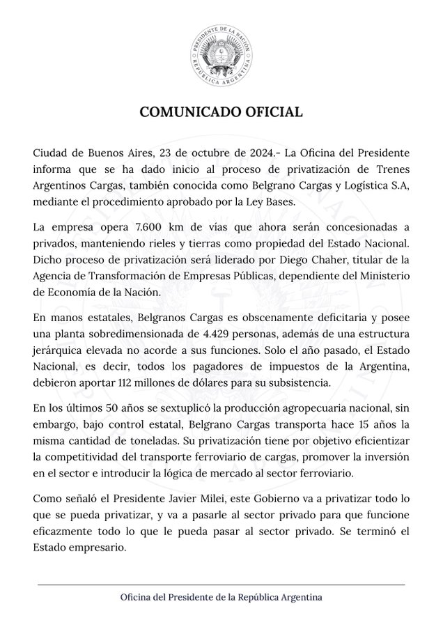 Así lo informó el vocero presidencial, Manuel Adorni, en declaraciones a la prensa: “Producto de la Ley Bases se procederá a privatizar la empresa Belgrano Cargas y Logística Sociedad Anónima, la primera privatización de una empresa ferroviaria desde que asumió la administración del presidente Milei en diciembre pasado.