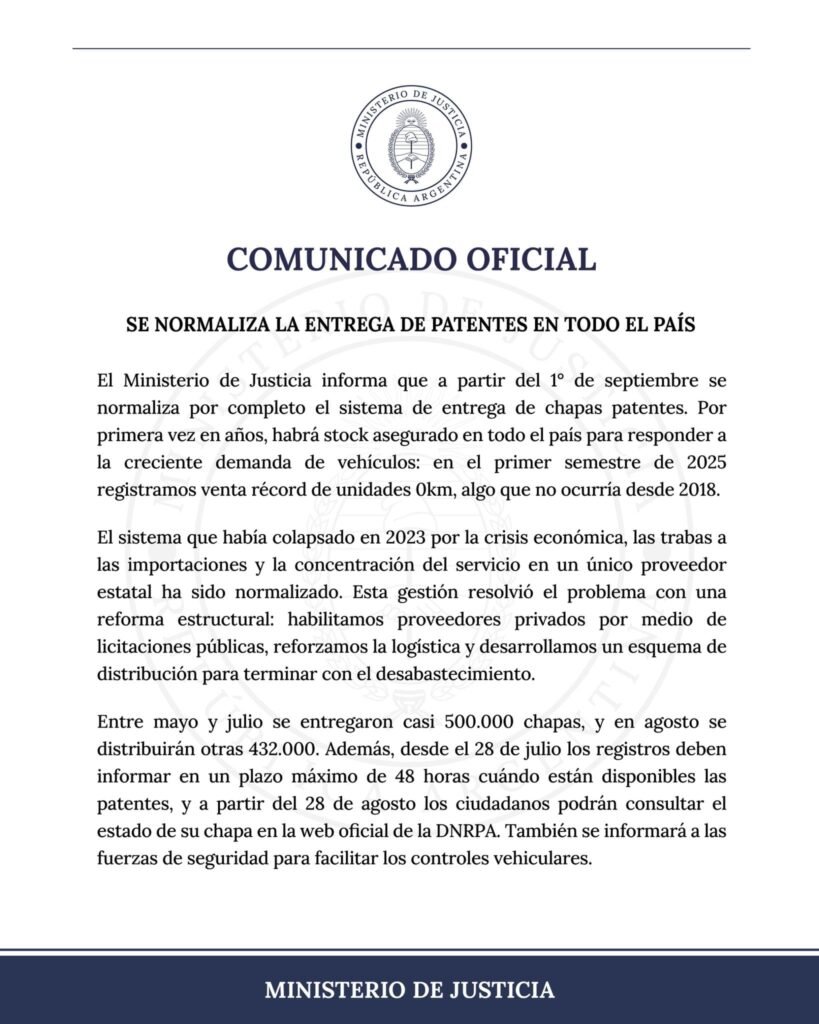 El Ministerio de Justicia de la Nación confirmó que a partir del 1° de septiembre quedará completamente normalizado el sistema de entrega de chapas patentes en todo el país, tras más de un año de demoras que afectaron la matriculación de vehículos nuevos. La medida incluye la puesta en marcha de un nuevo esquema de producción y distribución, que permitirá atender la creciente demanda generada por el récord de ventas de unidades 0 km registrado en el primer semestre de 2025.
