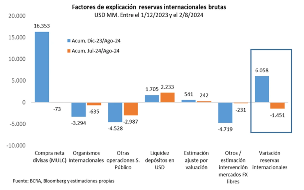 La entidad que preside Santiago Bausili, hasta mayo de 2024, había logrado acumular sostenidamente reservas internacionales. Sin embargo, desde mediados de ese mes, las compras netas de divisas se estancaron y desde julio las reservas comenzaron a disminuir.