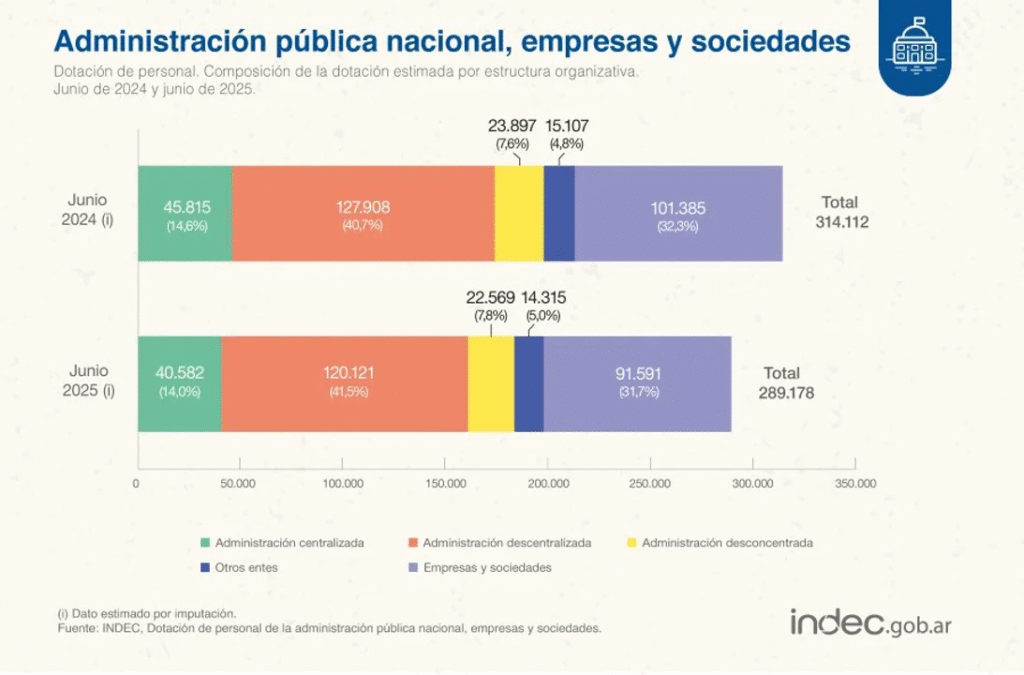 Entre enero del 2024 y junio del 2025, el personal de la APN se redujo más de un 13%. Desde la llegada del gobierno de Javier Milei, la cantidad de personal despedido de la administración pública nacional, empresas y sociedades llegó a un total de 44.606, según informó el Instituto Nacional de Estadísticas y Censos (INDEC).