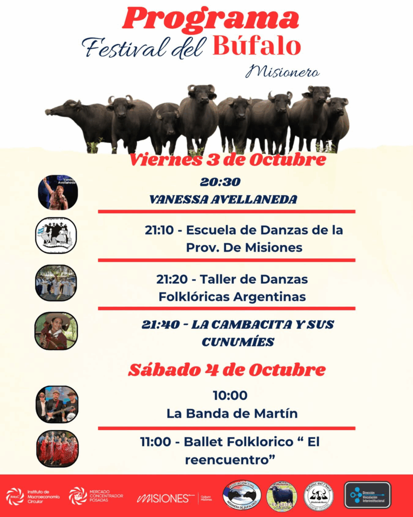 El gran atractivo de la jornada será el espectáculo culinario de un búfalo entero asado, que se pondrá a cocinar desde la tarde, lo que será la postal principal de la noche. La velada también contará con las presentaciones de Vanessa Avellaneda a las 20:30, la Escuela de Danzas de la Provincia de Misiones y el Taller de Danzas Folklóricas Argentinas (Casa del Bicentenario) a las 21:20, y el cierre con La Cambacita y sus Cunumíes a las 21:20.