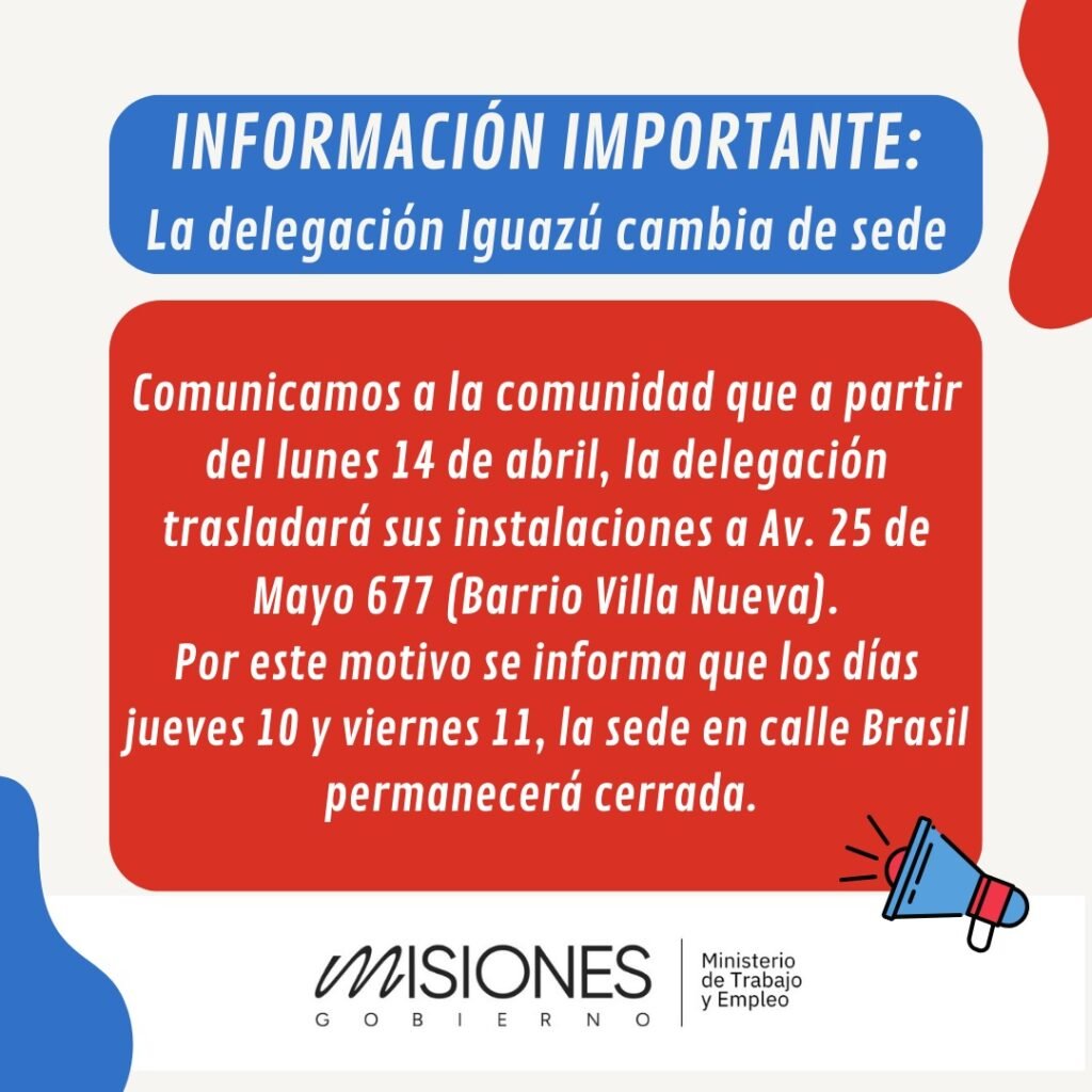 El Ministerio de Trabajo y Empleo de la provincia de Misiones comunica que, a partir del lunes 14 de abril, la delegación de la localidad de Puerto Iguazú comenzará a funcionar en su nueva sede propia, ubicada en Av, 25 de Mayo 677 (Barrio Villa Nueva).