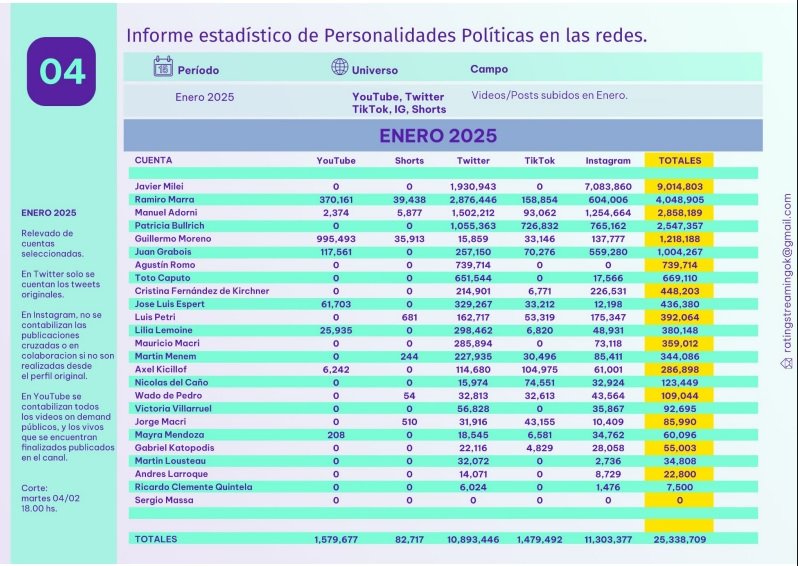 Un nuevo relevamiento de la consultora Rating Streaming tomó a once políticos vinculados al oficialismo y a catorce de la oposición, con el registro del llamado “consumo intenso”, lo que abarca el consumo voluntario de plataformas: visualizaciones en on demand de YouTube, y reacciones en Shorts YT, Instagram, Tiktok y X (ex-Twitter). El informe además midió la incidencia en las redes de medios de comunicación, así como de las cuentas llamadas “amplificadoras”.