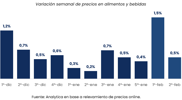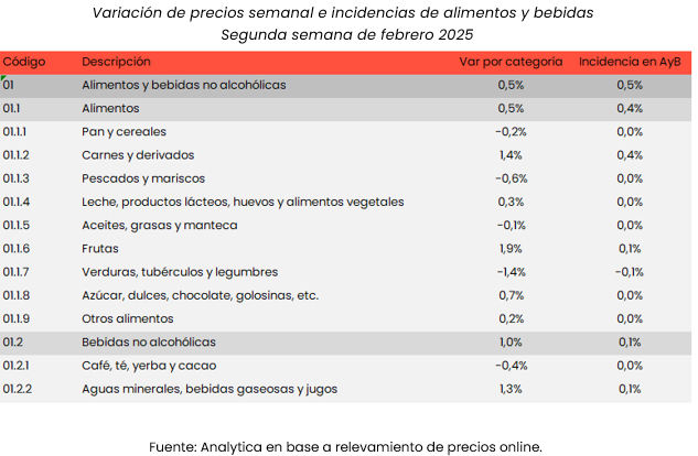 De acuerdo con el último relevamiento de la consultora Analytica, los precios de alimentos y bebidas en el Gran Buenos Aires registraron una variación del 0,5% en la segunda semana de febrero, mientras que el promedio de las últimas cuatro semanas se ubicó en 2,5%.