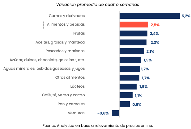Por otro lado, los incrementos más moderados se dieron en café, té, yerba y cacao (+1,1%) y pan y cereales (+0,9%), mientras que las verduras registraron una caída del -0,6%.