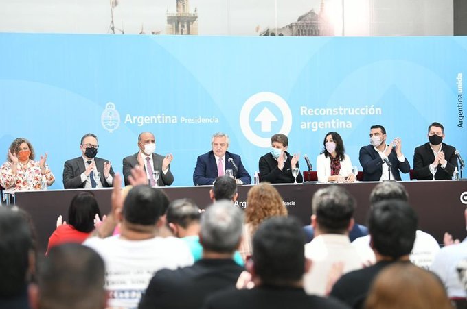 Acompañado por el jefe de Gabinete, Juan Manzur; los ministros de Desarrollo Productivo, Matías Kulfas y de Interior, Wado de Pedro; los intendentes de Ushuaia, Walter Vuoto; y de Río Grande, Martín Pérez; y la secretaria de Legal y Técnica, Vilma Ibarra; legisladores nacionales y provinciales y CEOs y representantes de las compañías radicadas en la provincia, Fernández anunció también un acuerdo con los empresarios locales para la implementación de un bono de 40 mil pesos para los empleados y empleadas en noviembre.
