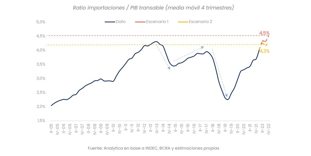 • ¿Hasta qué nivel necesita profundizar el cepo cambiario el gobierno? Para contestar esta pregunta realizamos una simulación con nuestro modelo de consistencia macroeconómica. El gráfico a continuación muestra en la línea azul la relación entre el nivel de importaciones y el producto correspondiente a sectores de bienes transables (principalmente agro, minería, comercio e industria manufacturera). Podemos observar que entre el 2014 y el 2015 el requerimiento unitario de importaciones cayó a pesar de la apreciación cambiaria (-8,5%). Eso fue posible a través de un férreo control de importaciones en la aduana mediante licencias no automáticas y declaraciones juradas anticipadas. La tendencia se revirtió desde el tercer trimestre de 2015 hasta el cuarto trimestre de 2017, cuando la fuerte devaluación (+96%) y el estancamiento de la actividad (+1%) desincentivaron las importaciones (+13%). Sin embargo, desde el 2020 las compras al exterior respecto al nivel de producción de bienes transables tienen una tendencia creciente.