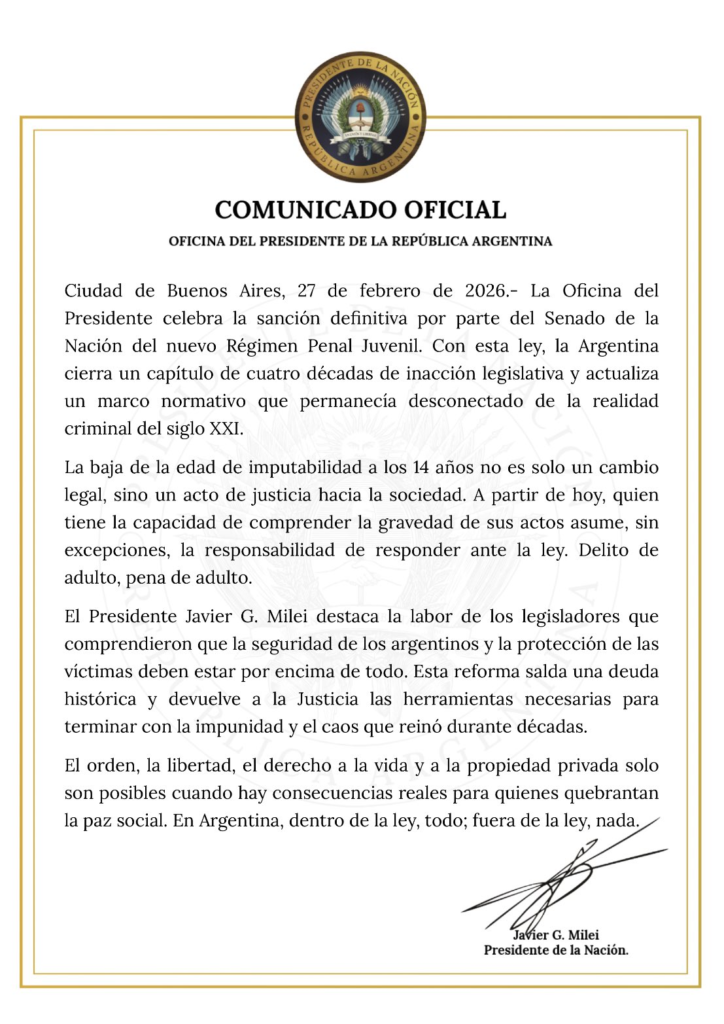 Desde el Ejecutivo emitieron un comunicado, donde Milei felicita a los legisladores por aprobar la norma.