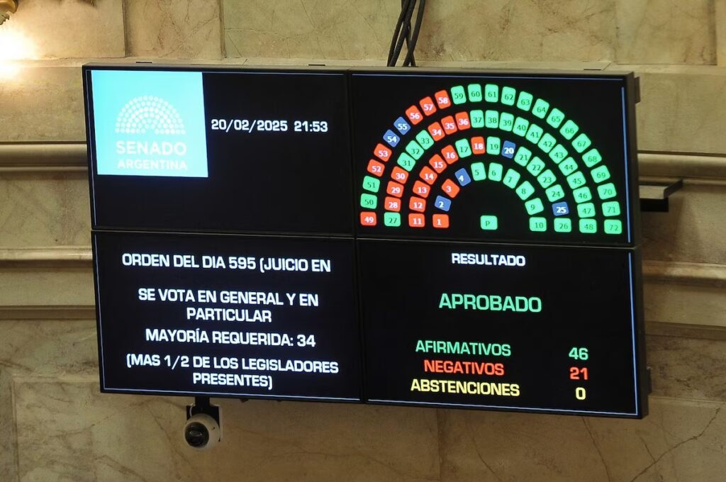 El pleno del Senado sancionó la ley que activa la implementación del juicio en ausencia y el Gobierno logró una nueva victoria dentro de las sesiones extraordinarias, que finalizan mañana. La iniciativa obtuvo, durante la noche de este jueves, 45 votos del oficialismo y la oposición dialoguista, mientras que el kirchnerismo volvió a fracturarse, entre un par de adhesiones y muchos rechazos.