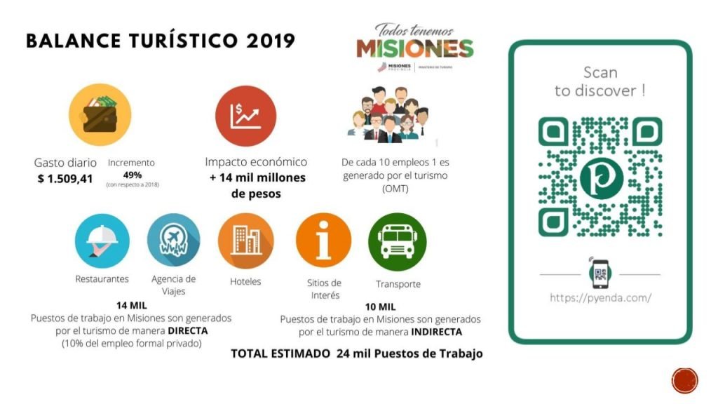 De acuerdo a la evaluación del equipo estadístico, el corriente año registró a la fecha más de 2 millones de arribos de turistas a la provincia (11% más que el 2018), y un incremento en los días de pernocte de una noche (3,5) en periodo estacional y de dos noches (5,2) en temporada alta; resultado que le valió a la economía misionera una inyección de más de 14 mil millones de pesos. El gasto diario promedio por persona fue de $1509.41