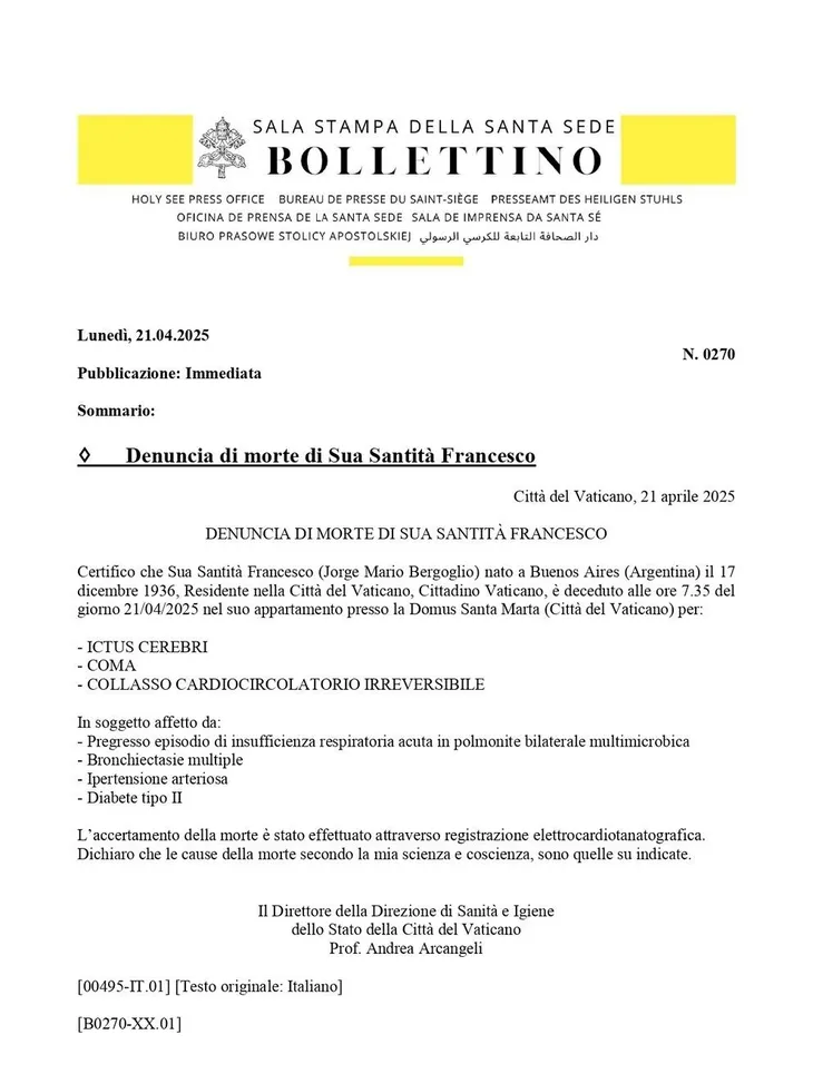“Certifico que Su Santidad Francisco (Jorge Mario Bergoglio) nacido en Buenos Aires (Argentina) el 17 de diciembre de 1936, residente en la Ciudad del Vaticano, Ciudadano del Vaticano, falleció a las 7.35 horas del día 21/04/2025 en su piso de la Domus Santa Marta (Ciudad del Vaticano) de: un derrame cerebral, coma y colapso cardiovascular irreversible”, dice el comunicado oficial.