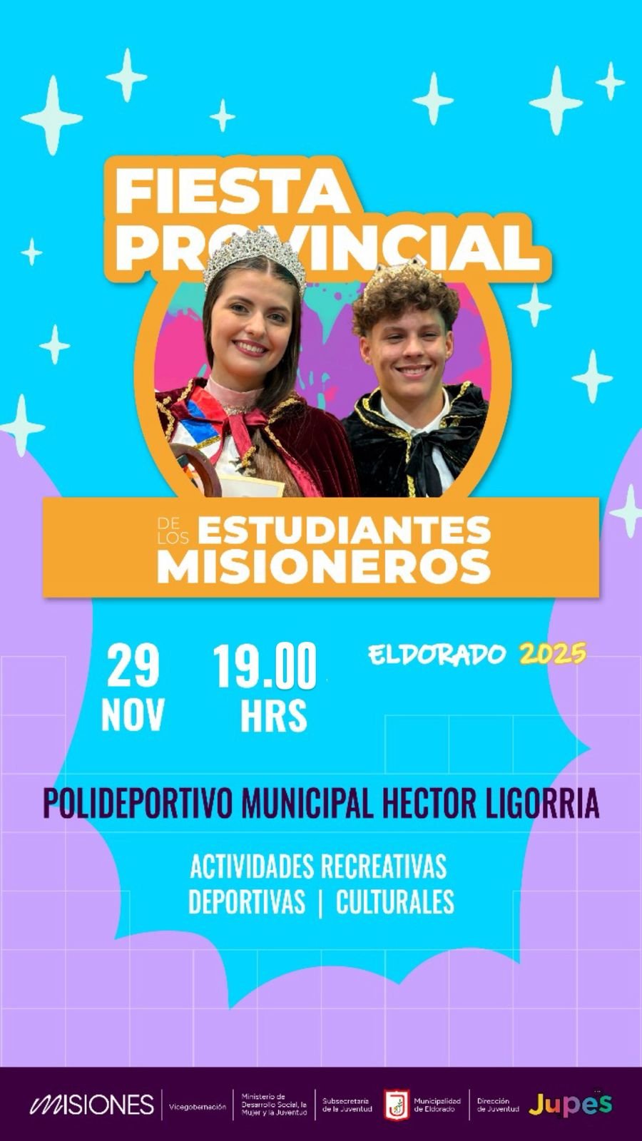 El próximo sábado 29 de noviembre se realizará, por primera vez en la ciudad de Eldorado, la Fiesta Provincial de los Estudiantes Misioneros. El encuentro, organizado por el Ministerio de Desarrollo Social, la Mujer y la Juventud, junto a otros organismos del Estado, tendrá lugar en el Polideportivo Municipal Héctor Ligorria, ubicado en el kilómetro 9.