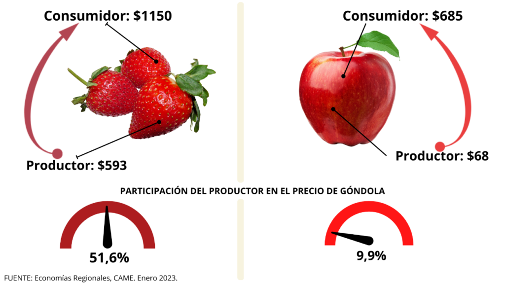 En promedio, la participación del productor explicó el 28,2% de los precios de venta final. Los productores de frutilla tuvieron la mayor participación (51,6%), mientras que la menor fue para los de manzana roja (9,9%).